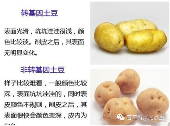 转基因土豆:表面光滑,坑坑洼洼很浅,颜色比较淡。削皮之后,其表面无明显变化。检验方法:先削皮后看变化再决定吃不吃。